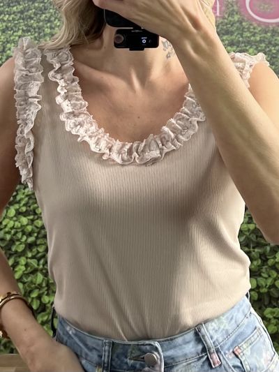 18. Lace Neck&Sleeves Rip Top/Beige
