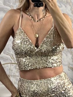 Κοντό τοπ λεοπάρ με λεπτές ελαστικές τιράντες και παγιέτες, ONE SIZE. Διαθέτει cups. Καλύπτει μέχρι 90cm στήθος.